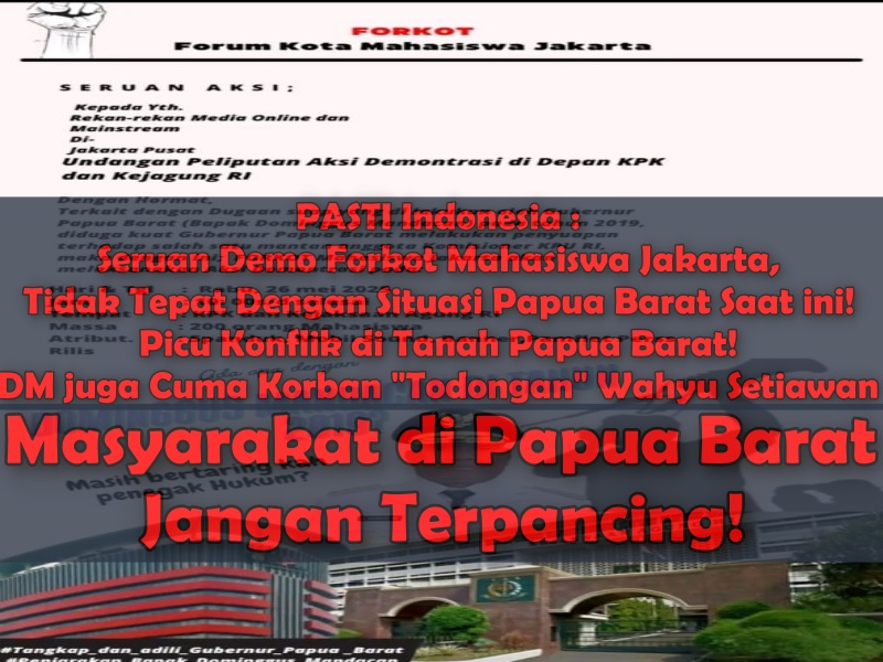 PASTI Indonesia mengapresiasi sikap Kritis Forkot Mahasiswa Jakarta namun sayangnya seruan Aksi Forkot Mahasiwa Jakarta kurang tepat, dikarenakan Dominggus Mandacan dalam persoalan ini juga sebagai “Korban” dari Wahyu Setiawan. Dan Aksi yang di lakukan oleh Forkot Mahasiwa Jakarta dapat memicu Konflik di Tanah Papua Barat, yang saat ini sendiri kondisinya sedang tidak baik-baik saja,dikarenakan Efisiensi Anggaran sehingga menghambat beberapa Program Pembangunan di Papua Barat.